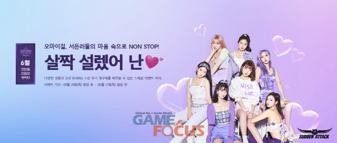 '서든어택'은 '오마이걸' 캐릭터 업데이트를 기념해 이벤트를 실시한다. 우선 6월 11일까지 '오마이걸' 캐릭터로 '이달의 캐릭터'를 활성화하면 영구제 밀봉 아이템과 캐릭터 프리 티켓을 제공한다. 캐릭터 기간을 누적 300일 이상 모으면 캐릭터 선택권(영구제)을 지급하며 이들 중 선착순 300명에게는 '오마이걸 키링'을, 추첨으로 70명에게는 '오마이걸' 싸인 폴라로이드를 지급한다. 추가로 신규 Bubble 스킨 무기, '오마이걸' 마우스패드, 특별 칭호 등과 교환 혹은 즉석 당첨에 응모할 수 있는 응모권을 제공한다.