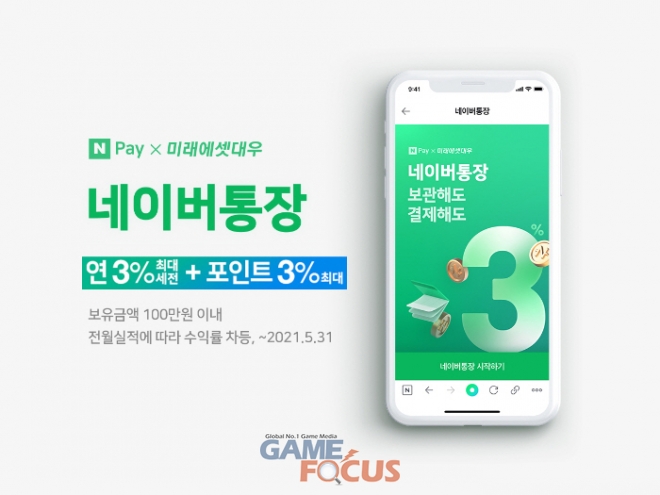 ‘네이버통장’은 네이버파이낸셜이 미래에셋대우와 함께 출시하는 수시입출금 CMA 통장으로, 예치금 보관에 따른 3% 수익뿐 아니라 통장과 연결된 네이버페이로 충전∙결제 시 3%의 포인트 적립 혜택도 함께 제공하는 것이 특징이다.