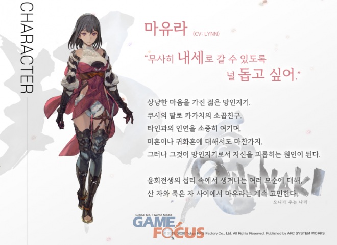아크시스템웍스 아시아지점은 오늘부터 공식 블로그를 통해 '오니가 우는 나라'에 등장하는 7명의 주요 캐릭터와 10명의 귀화혼에 대한 소개를 매주 정기적으로 공개할 예정이다.