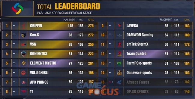 GRIFFIN은 지난 PCS 아시아 채리티 쇼다운에서 14위로 아쉬운 성적을 기록했지만, 이번 한국 대표 선발전 파이널 스테이지에서는 초반부터 선두를 달리며 종합 1위로 대회를 마쳤다. VSG는 마지막 날 1 매치에서 치킨을 획득하며 GRIFFIN을 바짝 쫓았고, OGN ENTUS는 3 매치까지 불과 3점 차이로 VRLU GHIBLI(브이알루 기블리)와 출전권을 놓고 다투었지만 막판에 격차를 벌리는 데 성공했다. VRLU GHIBLI는 마지막 매치에서 15위를 기록, 종합 6위에 머물렀다.