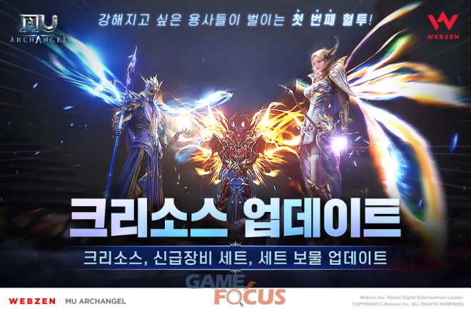 웹젠은 오늘(6월 18일) 오후 3시 30분부터 '뮤 아크엔젤'의 업데이트 점검 시간을 갖고, 출시 후 첫 번째 업데이트를 진행한다. 성물을 채집해 진귀한 아이템들을 획득하는 전장 '크리소스'와 신규 장비 '신급장비 세트', '세트 보물' 등의 여러 콘텐츠를 도입한다.