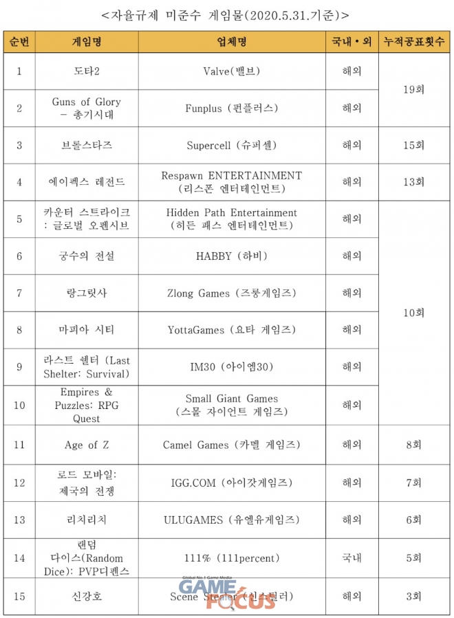 한국게임정책자율기구(이하 ‘기구’)는 한국게임산업협회(이하 ‘협회’)에서 시행하고 있는 강화된 '건강한 게임문화 조성을 위한 자율규제 강령(이하 ‘강령’)'에 따라 미준수 게임물을 2020년 6월 22일 19차 공표하였다.