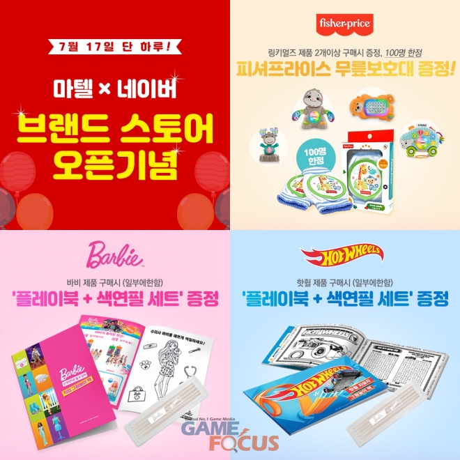 바비 드림토피아 세트 등 바비 행사 제품을 구매하면 바비 직업 그림놀이 책+색연필 세트를, 핫휠 플레이세트 또는 트랙빌더를 구매하면 핫휠 자동차 그림놀이 책+색연필 세트를 각각 사은품으로 받을 수 있다. 더불어 네이버 마텔 브랜드스토어를 스토어찜 하면 5% 할인 쿠폰이 지급된다.
