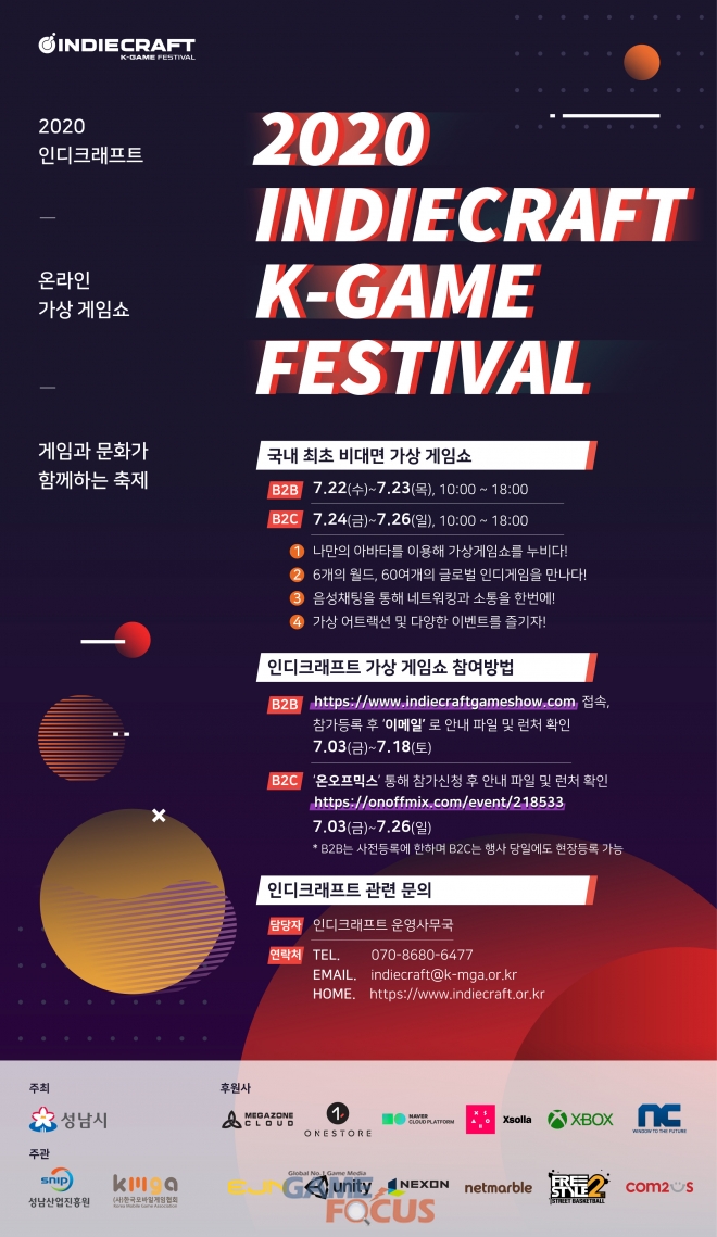 성남시가 주최하고 성남산업진흥원과 한국모바일게임협회가 공동주관하는 '2020 인디크래프트 온라인 가상게임쇼'는 '게임은 문화다'라는 슬로건 아래 국내외 우수 인디게임을 발굴하고, 건전한 게임문화 조성 밀 게임산업의 새로운 혁신 열기를 재점화 하여 개발자-유저-플랫폼이 서로 상생하는 생태계를 조성하기 위해 추진하고 있는 행사다. 특히 코로나19로 인해 전 세계가 침체되어 있는 지금, 대한민국 게임산업의 풀뿌리이자 허리인 '중소 인디게임'으로 극복하고자 하는 큰 의미를 담고 있다.