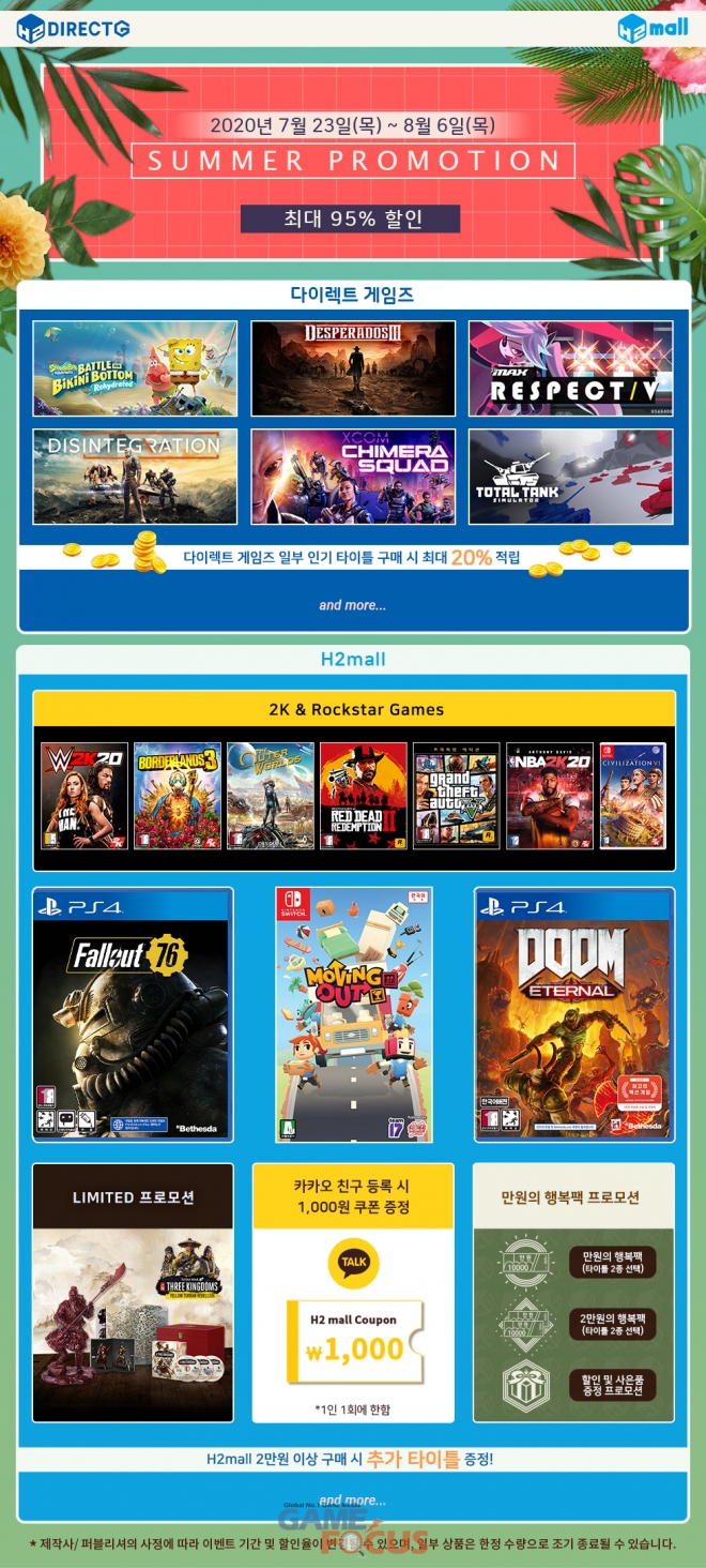 에이치투 인터렉티브(대표 허준하)가 디지털 유통 서비스인 다이렉트 게임즈와 패키지 쇼핑몰 H2몰을 통해 여름 특별 할인을 비롯한 다양한 프로모션을 진행한다.