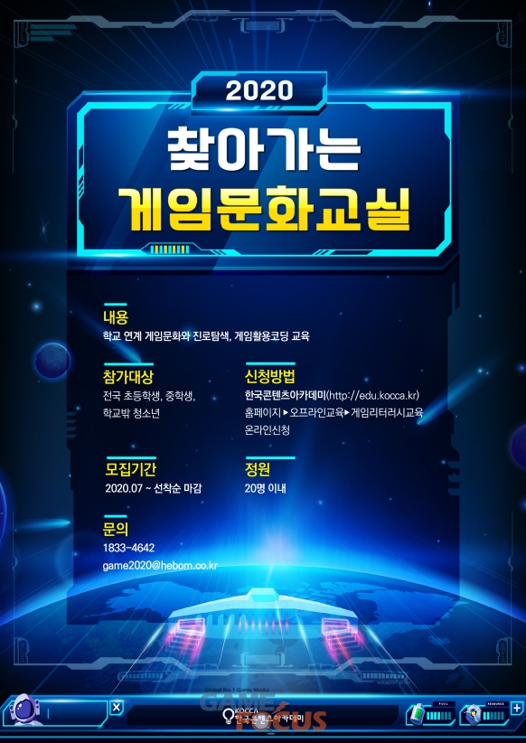 콘진원은 '2020 찾아가는 게임문화교실'의 참가 신청을 07월 27일부터 신청을 받는다고 밝혔다. 참여를 원하는 학교는 한국콘텐츠아카데미 사이트에서 신청할 수 있으며, 선착순으로 신청이 마무리된다고 밝혔다.