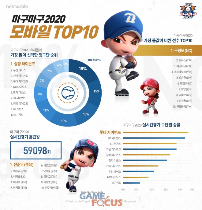 넷마블(대표 권영식, 이승원)은 신작 야구게임 '마구마구2020 모바일(개발사 넷마블앤파크)'이용자 데이터를 기반으로 선정한 선호구단, 홈런왕 등 다양한 TOP10을 공식포럼에 공개했다.