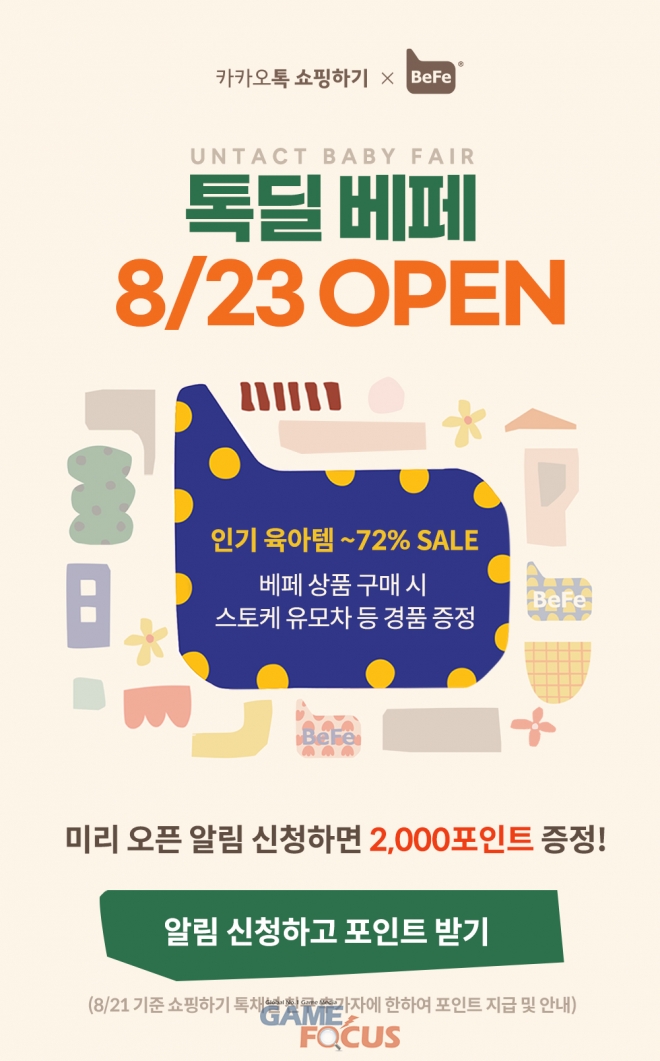 톡딜베페에 앞서 21일까지 카카오톡 '카카오톡 쇼핑하기' 채널에서 알림을 신청한 5만명에게 카카오톡 쇼핑하기, 카카오톡 선물하기, 카카오 메이커스에서 현금처럼 사용이 가능한 쇼핑포인트 2000P(포인트 1P는 현금 1원과 동일한 가치를 지님) 적립을 제공한다. 또, 톡딜베페 상품 구매고객에게는 추첨을 통해 스토케 유모차, 유팡 젖병소독기, 브라운 체온계, 스타벅스 모바일교환권 등 선물을 증정한다.