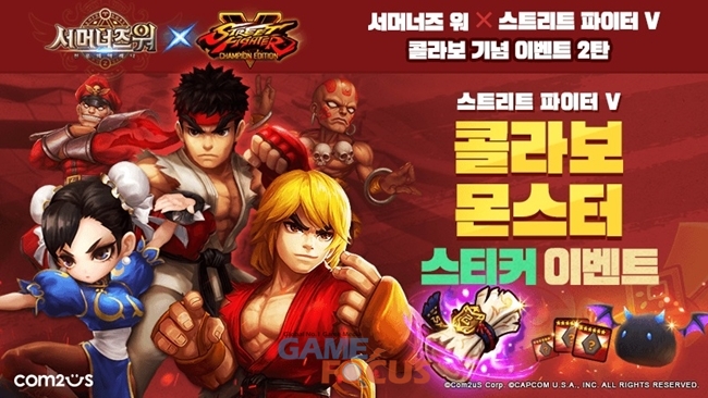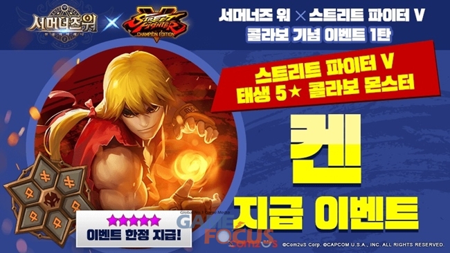 모바일게임 기업 컴투스(대표 송병준)가 글로벌 인기작 '서머너즈 워: 천공의 아레나(이하 서머너즈 워)'와 캡콤의 대전 격투게임 '스트리트 파이터 V: 챔피언 에디션'과의 콜라보레이션 업데이트를 실시하고, 콜라보 몬스터 '켄' 지급 등 다양한 이벤트를 진행한다.