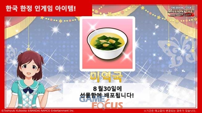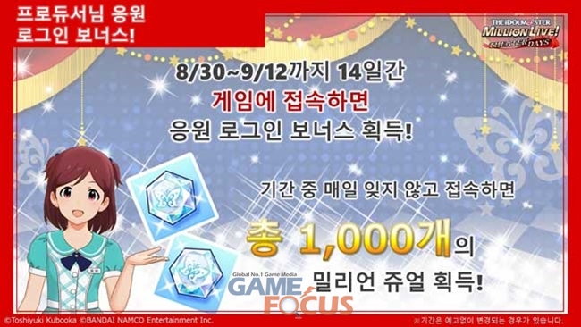 반다이남코 엔터테인먼트(대표 미야카와 야스오)가 앱스토어 및 구글플레이용 게임 '아이돌 마스터 밀리언 라이브! 시어터 데이즈'(이하 '밀리시타')의 한국판 서비스 1주년을 맞아 업데이트와 함께 이를 기념한 매일 10 연속 뽑기 무료 캠페인과 호화 선물을 증정하는 이벤트를 진행한다.