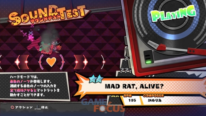 클리어한 스테이지의 악곡을 들을 수도 있다. 호화 아티스트들의 흥겨운 악곡을 천천히 즐겨보자. 매드 래트에게 액션을 시킬 수도 있으니, 어려운 곡은 여기서 연습하자.