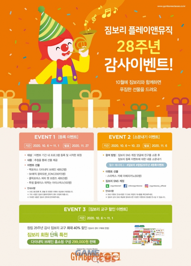 (주)한국짐보리짐월드(대표 박기영)의 세계적인 프리미엄 통합놀이 프로그램 '짐보리 플레이앤뮤직'이 국내 론칭 28주년을 기념하여 고객 감사 이벤트를 실시한다고 밝혔다.