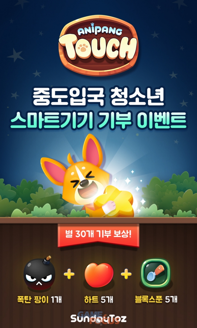 이번 행사는 '애니팡 터치' 이용자들이 퍼즐 스테이지를 플레이하며 별 150만 개를 모으면 선데이토즈가 중도입국 청소년들이 재학 중인 대안학교 3곳에 스마트기기 구입 비용을 기부하는 행사다.