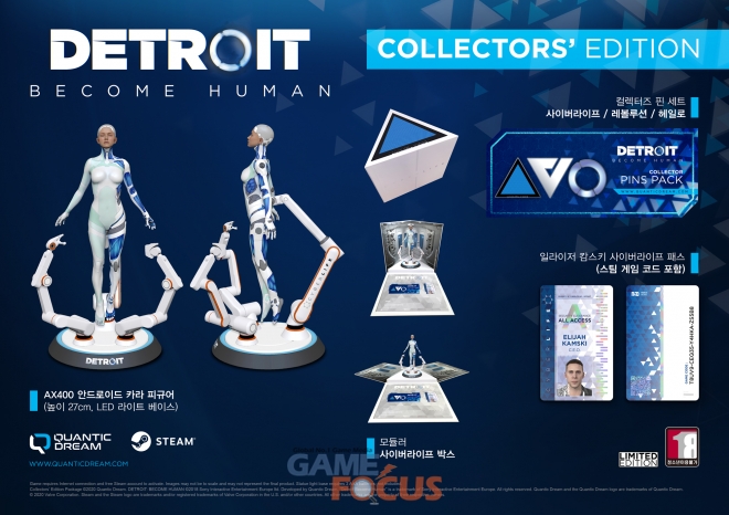 게임피아(대표 정종헌)가 Quantic Dream과 협력하여 인터랙티브 어드벤처 게임 'Detroit: Become Human' 컬렉터즈 에디션의 예약판매를 10월 8일부터 시작한다. 본 제품에는 Steam에서 플레이 할 수 있는 게임 코드가 들어 있으며, 게임은 한국어 자막을 공식 지원한다.