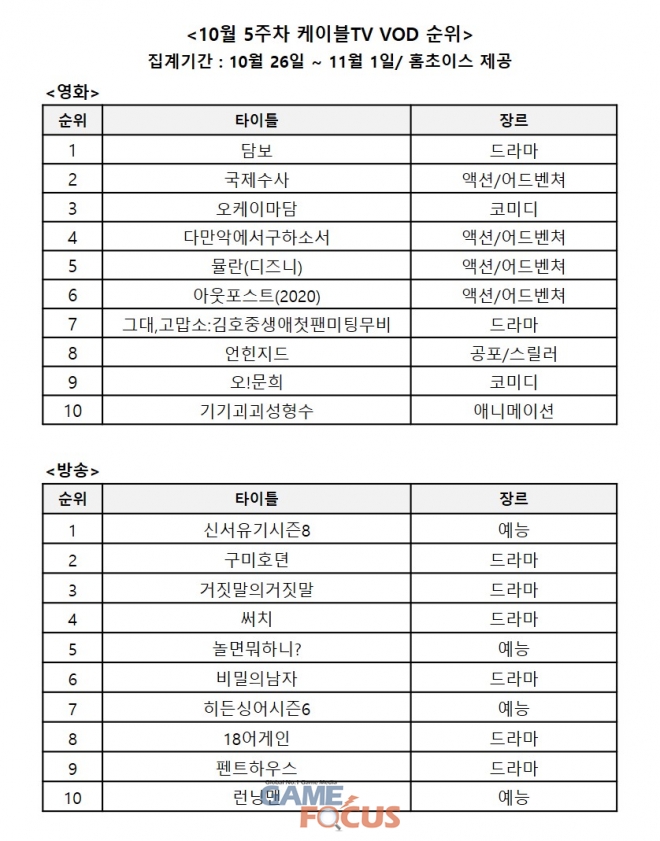 (주)홈초이스가 발표한 LG헬로비전, Btv 케이블, 딜라이브, CMB, 현대HCN 등 전국 케이블TV '10월 5주차 영화 · 방송 VOD 순위'에 따르면, '담보'가 영화 VOD 1위를 차지했다.