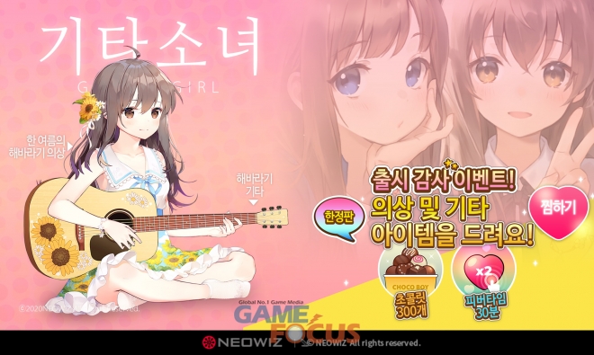 기타소녀는 글로벌 출시를 기념해 12월 7일까지 게임에 접속하는 모든 이용자에게 한정 의상인 ‘한여름의 해바라기’와 한정 기타 ‘해바라기’를 포함해, 초콜릿 300개, 피버 타임 30분 등 푸짐한 보상을 제공한다.
