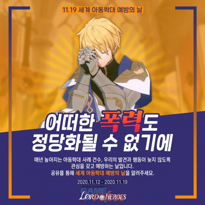 클로버게임즈가 모바일 RPG '로드 오브 히어로즈' 유저들과 함께 12일부터 세계 아동학대 예방의 날을 맞아 공유 캠페인을 진행한다.