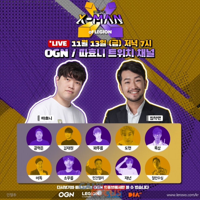 레노버의 게이밍 브랜드 리전(Legion)과 CJ ENM OGN과 다이아 티비가 공동 주최, 인텔이 후원하는 '게임콘 : X-MAN of LEGION'은 지난 해 다이아 티비가 개최한 한국 최초의 게임 크리에이터 축제 '게임콘'의 외전 성격으로 진행하는 언택트 예능 프로그램이다. 코로나19로 게임 크리에이터를 직접 만나지 못하는 팬들을 위해 실시간 스트리밍을 통해 프로그램을 진행한다.