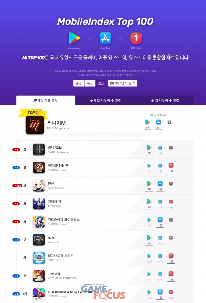10월 통합 랭킹에서는 또다시 최상위권 순위 변동이 일어났다. 엔씨소프트의 '리니지M' 1위 독주가 4개월째 지속된 가운데, '리니지2M'이 넥슨의 '바람의나라: 연'을 누르고 다시 2위 자리에 올라섰다. 리니지2M이 11월 말 서비스 1주년 기념 대규모 업데이트를 앞두고 있어 리니지 형제와 바람의나라: 연의 최상위권 순위 다툼은 한동안 지속될 것으로 보인다.