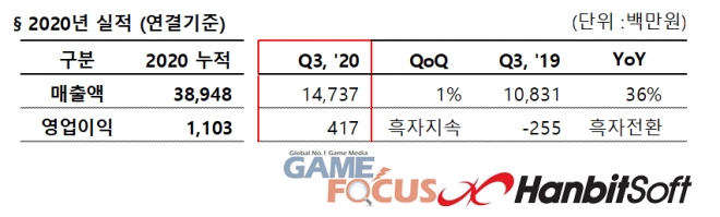 한빛소프트는 올해 3분기 연결 재무제표 기준 매출 147억원, 영업이익 4억원을 기록했다고 11월 13일 공시했다.