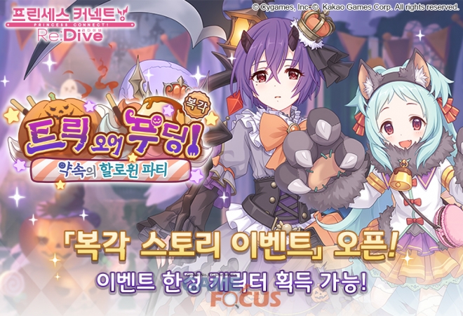 캐릭터 업데이트와 함께, '프린세스 커넥트! Re:Dive(리:다이브)'에서는 복각 스토리 이벤트 '트릭 오어 푸딩! 약속의 할로윈 파티'가 진행된다. 이용자들은 오는 23일(월)까지 진행되는 스토리 이벤트를 통해 길드 '악마왕국군(디아볼로스)'의 '시노부'와 '미야코'를 중심으로 한 특별한 스토리를 감상할 수 있다.