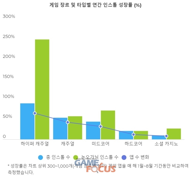 게임 장르별로는 ‘소프트'한(단순한) 게임일수록 총 인스톨 성장률이 높았다. 하이퍼 캐주얼, 캐주얼, 그리고 미드코어 게임 일부가 마니아 장르인 하드코어와 소셜 카지노 게임보다 성장률이 두 배 이상 높았다. 이는 코로나 대유행으로 집에 있는 시간이 늘어, 실내에서 즐길 거리를 찾다가 처음으로 모바일 게임을 해보는 사람들이 늘었다는 점을 반증한다는 것이 앱스플라이어 측의 분석.