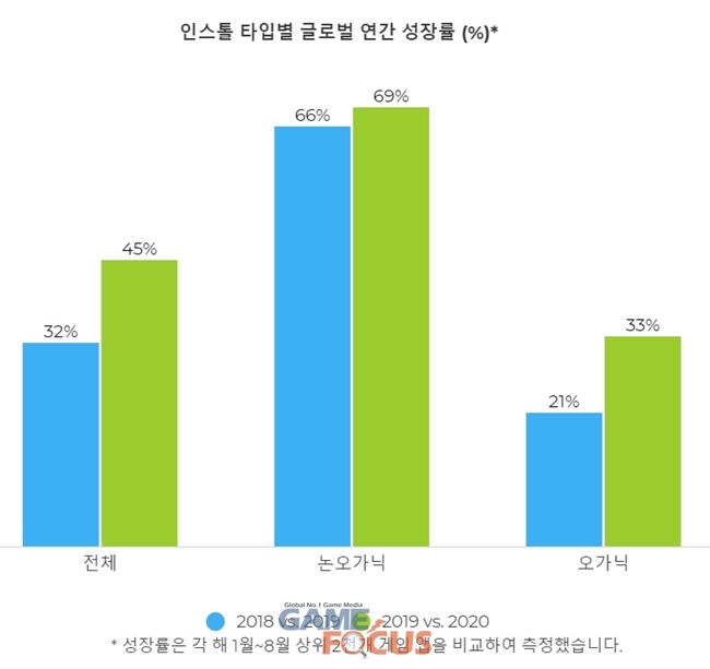 인스톨 증가를 견인한 또 다른 요인은 게임 업계의 활발한 마케팅이다. 조사에 따르면 2020년 오가닉 수요도 상당히 높았지만(33%) 논오가닉 인스톨 성장률(69%)은 오가닉의 두 배 이상을 기록했다. 심화된 경쟁 속에서 게임 앱이 자연스럽게 사용자 눈에 띄기란 극히 어려우며, 이에 오가닉 유입 가능성은 해가 갈수록 희박해지고 있다. 이에 상위권을 비롯한 모든 모바일 게임사들이 성장세를 끌어올리기 위해 마케팅에 주력하고 있는 모습이다. 또 게임사들이 플레이어 여정 초기부터 고도화된 데이터 기술을 이용한 마케팅을 전략적으로 실행하며 좋은 성과를 거둘 수 있었던 것으로 분석된다.