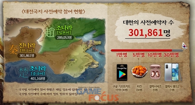 사전예약 페이지에서 확인할 수 있는 사전예약 상황으로는 '조나라'에 해당하는 일본 사전예약자 수치가 28만을 돌파하며 한국보다 약간 뒤쳐졌으며, '초나라'의 경우 동남아시아의 연합 국가인 만큼 숫자가 한국과 일본을 크게 웃도는 추세다.
