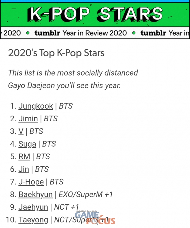 소셜 블로그 어플리케이션 텀블러가 '2020년 톱 K팝 스타'를 공식적으로 발표했다. 이는 해당 플랫폼 내 언급량으로 가장 인기 있는 K팝 스타를 결산해 100위까지 랭킹으로 공개한 것이다.