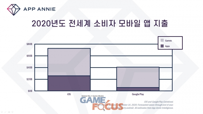 2020년 양대 앱스토어에서 비게임 및 게임 앱에 대한 전세계 소비자 지출은 연간 기준 역대 최고 수준을 기록할 전망이다. 비게임 앱은 310억 달러, 게임 앱에서만 810억 달러로 전년 대비 25% 상승한 총 1,120억 달러를 넘어 설 것으로 예상된다.
