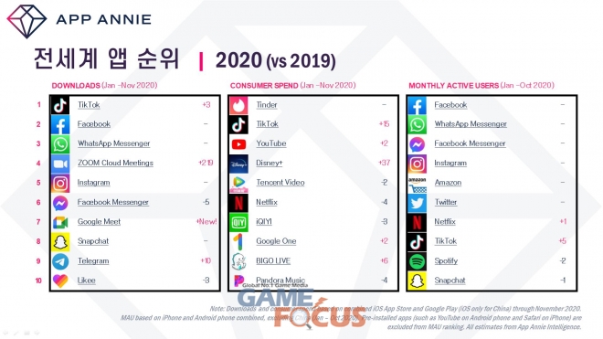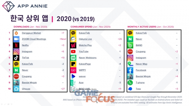 2020년 한국의 비게임 앱 다운로드 순위에서는 중고거래 플랫폼인 ‘당근마켓’이 작년보다 7단계 상승한 1위를 차지했다. ‘줌 클라우드 미팅’이 2위로 새롭게 등장했고, ‘넷플릭스’가 3단계 상승한 3위, ‘인스타그램’이 6단계 상승한 4위, ‘틱톡’이 10단계 상승해 5위를 차지했다. 코로나19로 집에 머무는 시간이 증가하면서 인테리어에 관심이 많아진 소비자들로 인해 원스톱 인테리어 플랫폼인 ‘오늘의집’이 무려 27단계 상승해 10위에 올랐다.