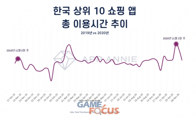모바일 데이터 및 분석 플랫폼인 앱애니(App Annie)가 코리아 세일 페스타 기간 첫 주 동안 행사에 참가하거나 자체 블랙프라이데이 프로모션을 전개한 상위 쇼핑앱을 선정, 이용 시간 및 MAU 랭킹을 발표했다.