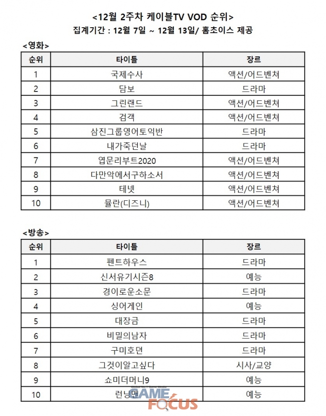 홈초이스가 발표한 LG헬로비전, Btv 케이블, 딜라이브, CMB, 현대HCN 등 전국 케이블TV '12월 2주차 영화 · 방송 VOD 순위'에 따르면, '국제수사'가 6주 만에 영화 VOD 1위를 되찾았다.