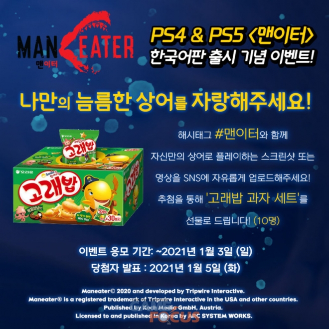 아크시스템웍스 아시아지점은 '맨이터' 한국어 번역판의 출시를 기념하여, 자신이 육성한 상어의 모습이 담긴 게임 플레이 스크린샷을 공유하여 이벤트에 참여하면, 추첨을 통해 ‘고래밥 과자 세트’를 총 10명에게 증정하는 이벤트를 오늘부터 개최한다. 이벤트에 대한 자세한 내용은 다음과 같다.