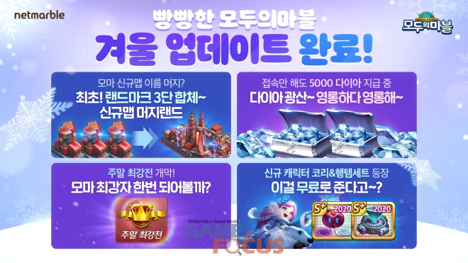 넷마블(대표 권영식, 이승원)이 모바일 캐주얼 보드게임 '모두의마블'에 신규 맵 '머지 랜드(Merge Land)'를 추가하는 등 '겨울 업데이트'를 실시했다.