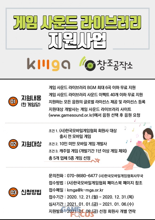 게임 사운드로 고충을 겪고 있는 협회 회원사 중 인디게임 개발사와 중소 게임개발사가 지원 대상이며, 이번 지원사업에는 5개 개발사 총 5종의 게임에 사운드 라이브러리를 활용한 게임 음악과 효과음을 지원할 예정이며, 이에 따른 글로벌 라이선스까지 제공한다. 21일부터 31일까지 한국모바일게임협회 회원사에 한해 이메일을 통해 접수를 받으며 이후 심사를 통해 최종 선발이 진행된다.