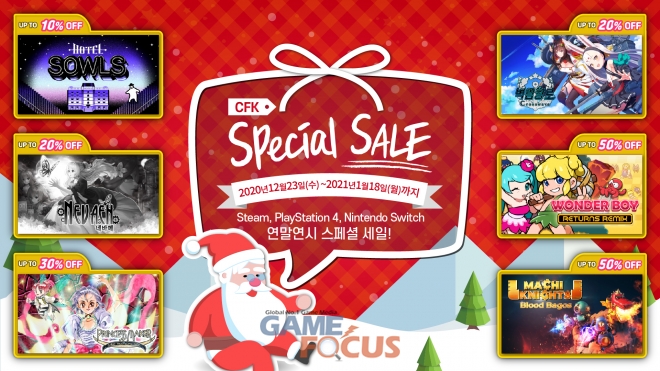 CFK가 겨울을 맞이해 '연말연시 스페셜 세일'을 진행한다. 이번 세일은 Steam, PlayStation 4, 닌텐도 스위치의 타이틀 위주로 진행되며, 각 플랫폼 스토어에서 최대 90% 할인된 가격으로 다양한 타이틀을 만나볼 수 있다.