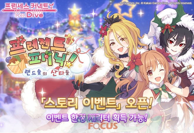 캐릭터 업데이트와 함께, '프린세스 커넥트! Re:Dive(리:다이브)'에서는 스토리 이벤트 '프레젠트 패닉! 랜드솔의 산타들'이 진행된다. 이용자들은 길드 '악마왕국군(디아볼로스)'의 '이리야'와 '왕궁기사단(NIGHTMARE)'의 '크리스티나', '카르미나' 소속의 '노조미'를 중심으로 한 특별한 스토리를 감상할 수 있다.