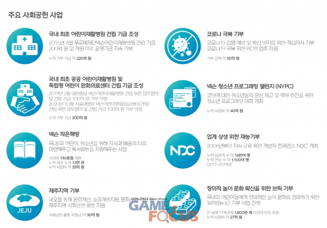 초중등생 대상 코딩 교육 플랫폼 투자를 확대해 미래 IT핵심 인재의 발굴 및 성장을 돕고, 국내 최초로 앞장서 진행해왔던 어린이 병원 건립 지원 등 사회 취약계층을 살피는 사회 상생형 공헌 방안도 더욱 적극적으로 찾아 나설 예정이다. 또한 국내 최대 지식공유 콘퍼런스로 자리매김한 ‘넥슨개발자콘퍼런스(NDC)’를 온라인으로 전환해 전문성을 갖춘 임직원들의 재능기부로 지식과 경험, 노하우를 공유하는 문화를 더욱 확산시켜 나갈 계획이다.