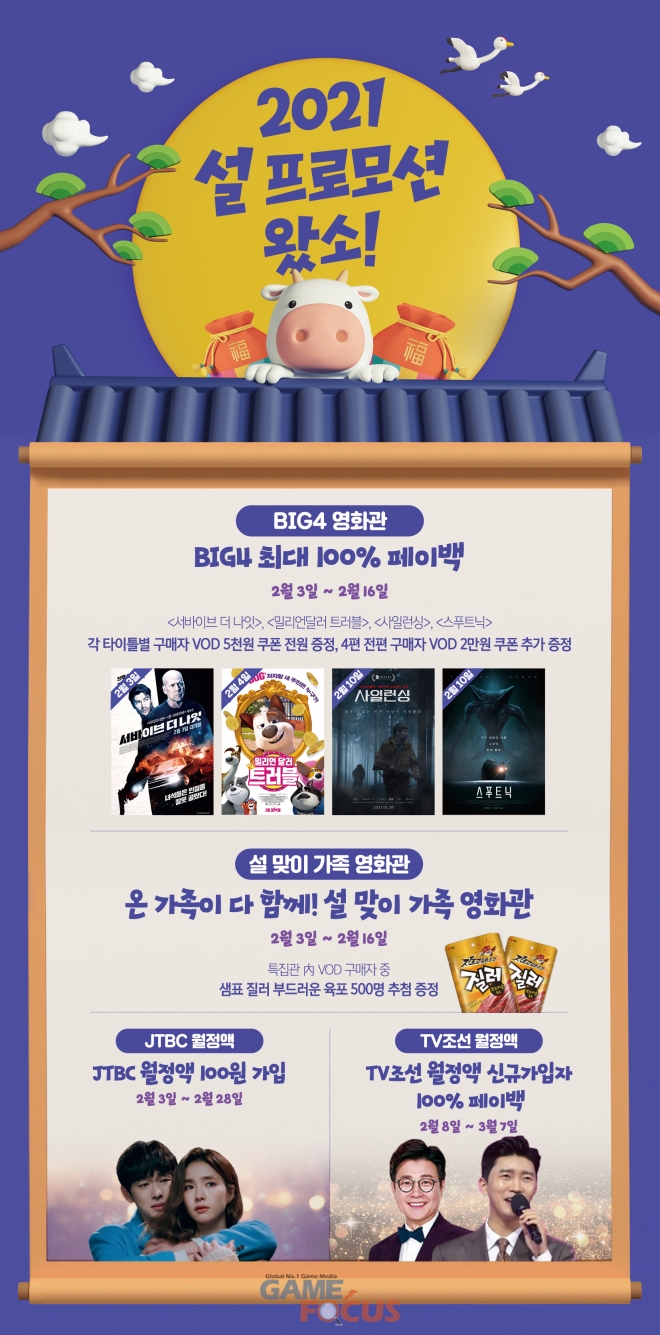 'BIG4 영화관' 4편 전편 구매자에게는 VOD 2만원 쿠폰을 추가 증정하여, 설 연휴 동안 영화 몰아보기를 계획한 고객들에게 최고의 혜택을 선사할 예정이다.