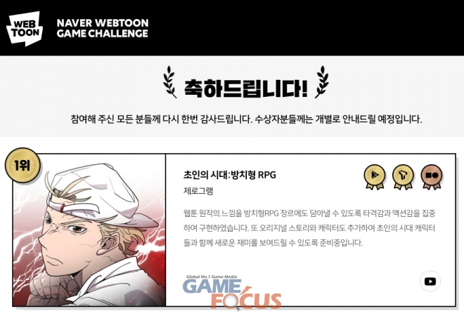 '네이버웹툰 게임 챌린지(NAVER WEBTOON GAME CHALLENGE)' 수상작과 특전에 대한 자세한 내용은 네이버웹툰 게임 챌린지 공식 홈페이지를 통해 확인할 수 있다.