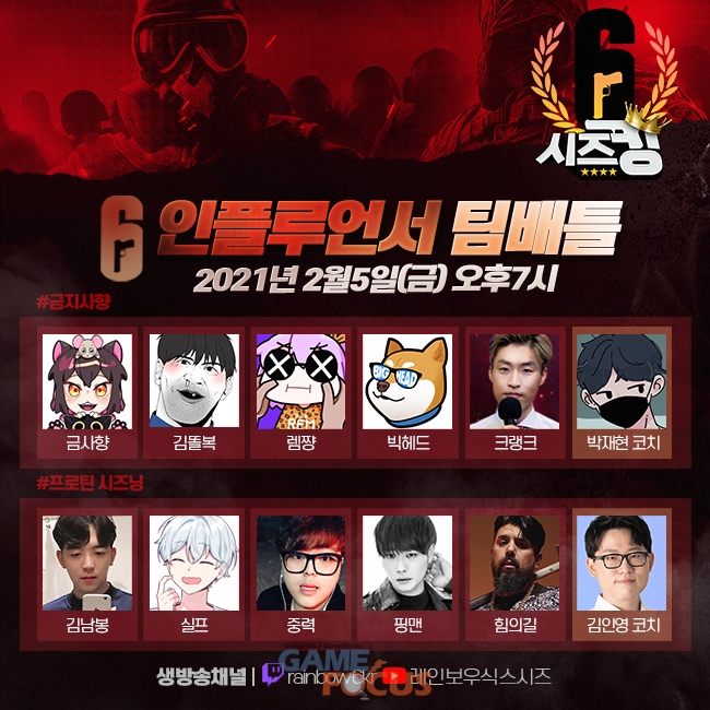 유비소프트 엔터테인먼트(Ubisoft Entertainment)는 자사의 전술 멀티플레이 FPS게임 레인보우식스 시즈(Tom Clancy's Rainbow Six Siege)의 인플루언서 팀 배틀 '시즈킹'을 오늘(5일) 저녁 7시에 진행한다고 밝혔다.