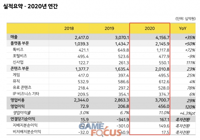 카카오(공동대표 여민수, 조수용)가 K-IFRS(한국국제회계기준) 기준 2020년 연간 매출이 전년 대비 35% 늘어난 4조1,567억원을 기록했다고 밝혔다.