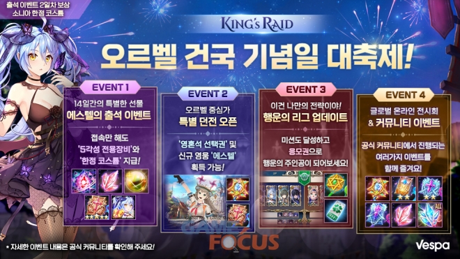 더불어 베스파는 '오르벨 건국 기념일'을 맞이해 '킹스레이드' 앱 아이콘과 수도 오르벨 왕성의 배경을 건국일 테마로 변경하고, 다채로운 혜택을 제공하는 이벤트를 진행한다.