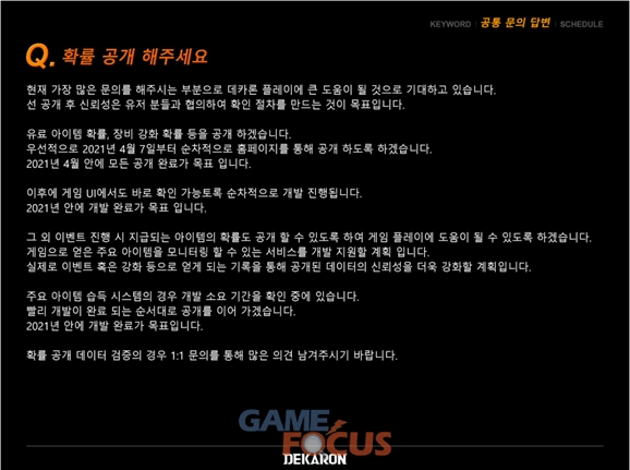 앞서 유비펀스튜디오는 3월 25일 유저들의 공통 문의 사항에 대한 답변과 앞으로의 데카론 개발 방향을 안내하였던 소규모 유저 간담회 내용을 공개했다. 공개된 내용에는 유저들의 중요 관심사인 확률 공개 내용이 포함되어 있다.