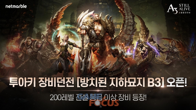 넷마블(대표 권영식, 이승원)이 모바일 최초 배틀로얄 MMORPG 'A3: 스틸얼라이브'에 신규 투아키 지역 장비던전 '방치된 지하묘지 B3'을 추가하는 등 업데이트를 실시했다.