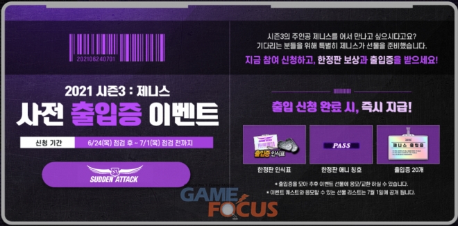 이와 함께 넥슨은 '2021 서든패스 시즌3: 제니스' 사전 신청 이벤트를 7월 1일까지 실시한다. '서든어택' 여름 캠페인으로 선보일 '서든패스 시즌3: 제니스'를 사전에 신청한 서든러들에게 '시즌3 제니스 출입증 20개', '출입증 인식표', '출입증 애니 칭호' 등을 제공한다.
