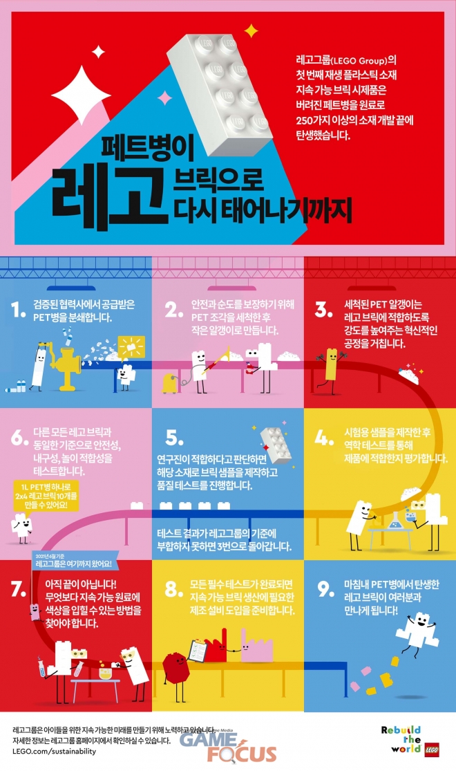 레고그룹 최초로 재활용 소재로 만들어진 이번 '지속 가능 브릭' 시제품은 버려진 병에서 추출한 PET 플라스틱을 원료로 탄생했다. 브릭간 결합력을 포함해 레고의 엄격한 품질 및 안전성 기준을 충족하는 것은 물론 미국식품의약국(FDA)과 유럽식품안전청(EFSA)으로부터 품질 인증을 거친 소재가 사용됐다. 평균적으로 1리터 페트병의 경우 약 10개의 2X4 레고 브릭으로 재탄생 될 수 있다.