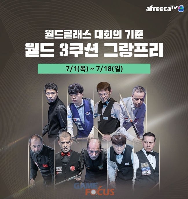아프리카TV는 7월 1일부터 18일간 2인 1조의 슛아웃 복식 경기와 8인 1조 개인전 리그로 펼쳐지는 '월드 3쿠션 그랑프리'를 생중계한다고 밝혔다. 총상금 4억 2000만원(우승 상금 1억원)이 걸린 세계 대회인 '월드 3쿠션 그랑프리'는 '호텔 인터불고 원주'가 타이틀 스폰서로 나선다.