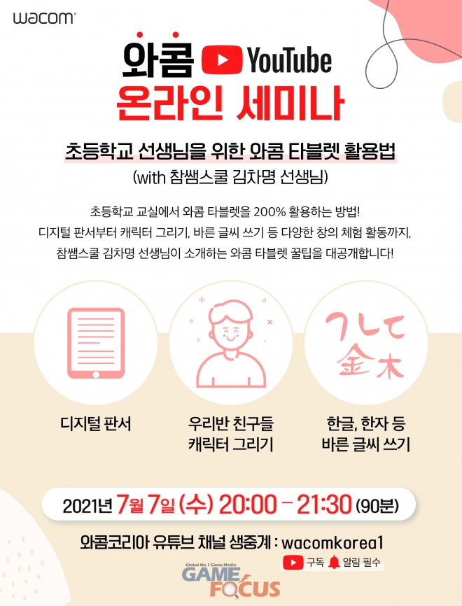 한국와콤(대표 김주형)은 참쌤스쿨 김차명 선생님과 함께 ‘교실에서 와콤 타블렛을 활용하는 방법’을 주제로 와콤 유튜브 온라인 세미나를 개최한다고 밝혔다. 와콤 유튜브 온라인 세미나는 7월 7일 수요일 오후 8시부터 90분간 와콤 공식 유튜브 채널에서 실시간 라이브 방송으로 진행되며, 타블렛 유무와 상관 없이 누구나 유튜브로 강연을 볼 수 있다.
